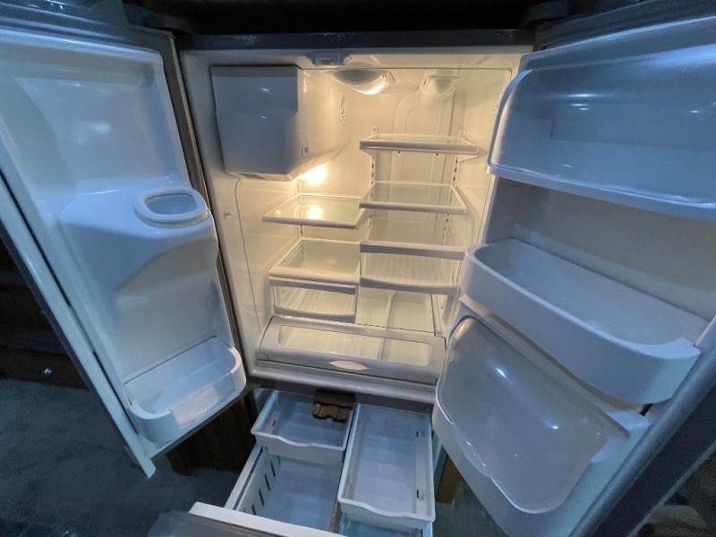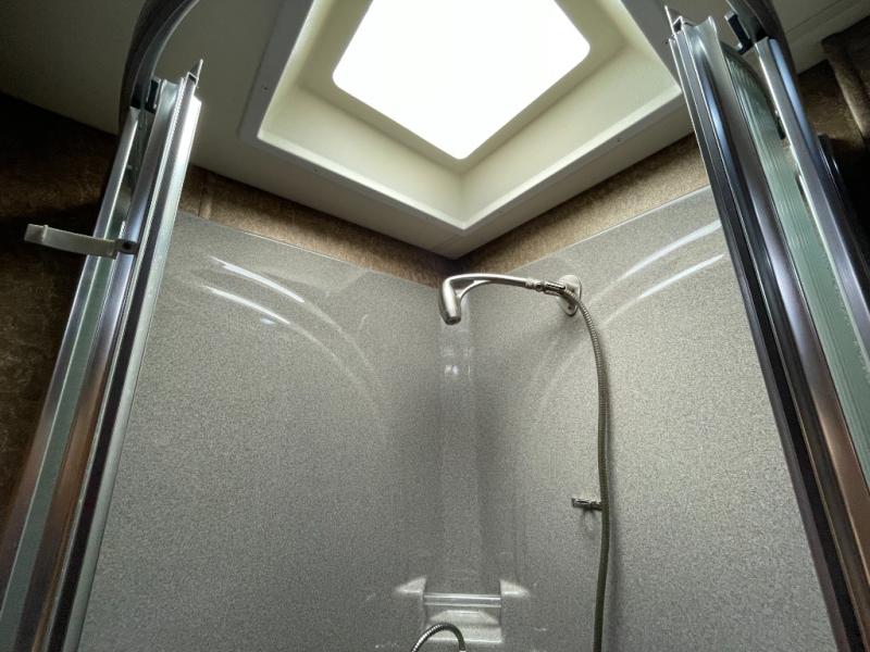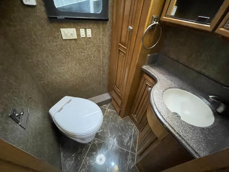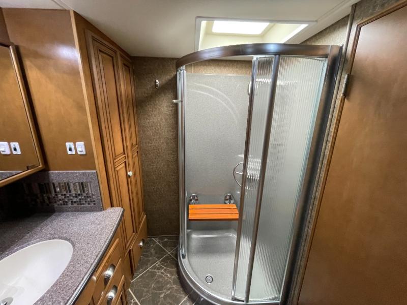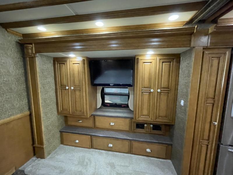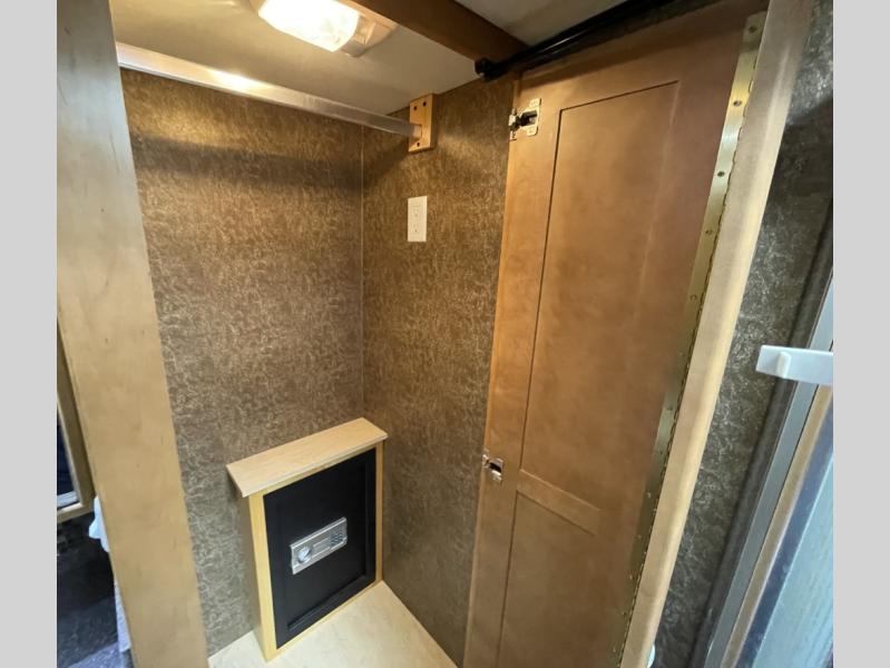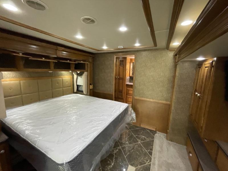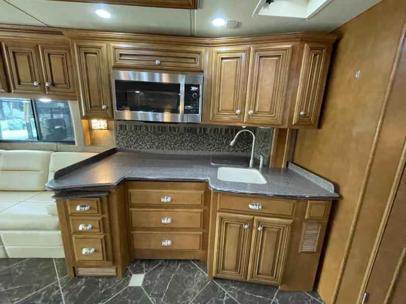 Step inside and you’re welcomed by a luxuriously appointed interior featuring handcrafted hardwood cabinetry, polished solid-surface countertops, and plush residential furnishings. The open floorplan creates a spacious, upscale atmosphere ideal for extended travel or full-time living. Large panoramic windows, elegant lighting, and premium finishes provide a warm, residential feel wherever the road takes you.