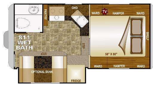 Arctic Fox Camper by Northwood Mfg. w/Rear Bumper w/Step, Back Door, Rear Corner Wet Bath w/Shower, Toilet & Sink, 1 Step Up to Booth Dinette & Refrigerator Slide, Pantry, 3 Burner Range, Dbl. Kitchen Sink, Overhead Cabinets, Front Step Up to Queen Bed w/Front Shelf, Wardrobes, Hampers and Much More. Available Options May Include: Bunk Above Dinette, 19" LCD TV w/Swing Arm.