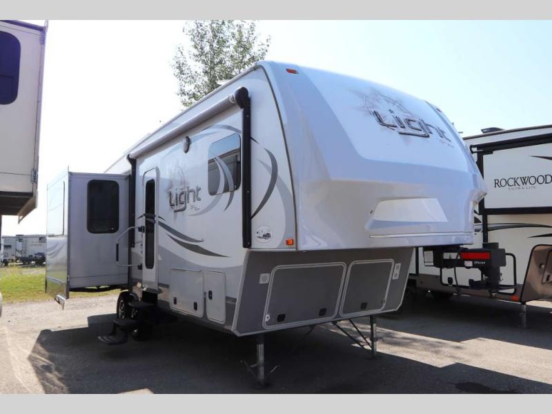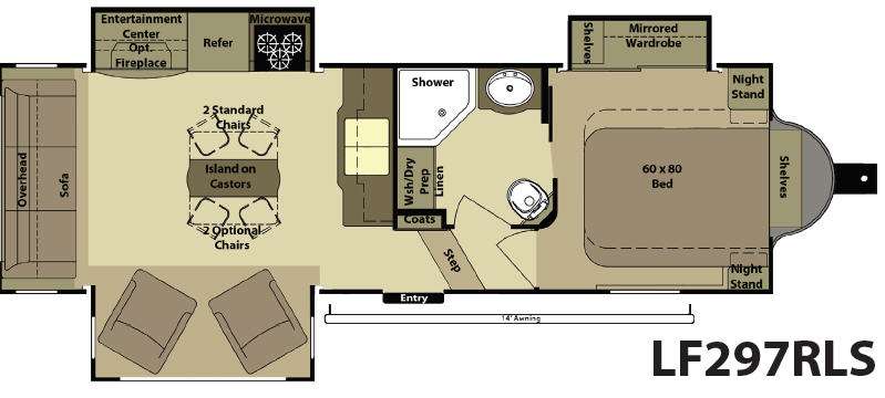 Open Range LIGHT Fifth Wheel w/Rear Sofa w/Overhead Storage, Slideout Area w/2 Chairs & End Table, Slideout Ent. Center w/Fireplace and Desk Top/Refrigerator & 3 Burner Range, Kitchen Island w/4 Backed Bar Height Chairs, Counter w/Overhead Storage & Sink, Step Up to Side Aisle Bath w/Angle Shower, Toilet & Sink & Washer/Dryer Prep/Linen, Front Queen Bed w/Storage Shelves Above & Nightstands Each Side, Slideout Wardrobe w/Mirrored Doors and Much More!