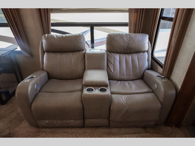 Rear Living Layout – Enjoy a spacious lounge featuring opposing slides, large picture windows, cozy seating, and a built-in entertainment center.