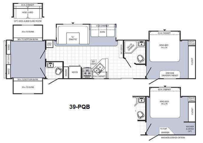 Palomino Puma Park Trailer w/Rear Bunkhouse Including Quad Slideout Bunks w/Lower Bunks 38x72 and Upper Bunks 30x72, Rear End Wall Ward./Ent. Center/Ward., 1/2 Bath w/Private Entry, Linen/Wardrobe, U-Dinette & Sofa Slideout, Pantry, Refrigerator, 3 Burner Range, Dbl. Kitchen Sink, Skylight, Ent. Center in Living Room, Side Aisle Bath w/Angle Shower, Toilet & Sink, Door to Front Bedroom w/Slideout King Bed, Overhead Cabinet, Closet, Nightstand, Dresser, Private Bedroom Entry and Much More!