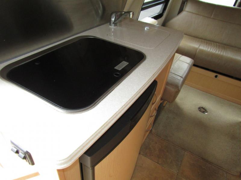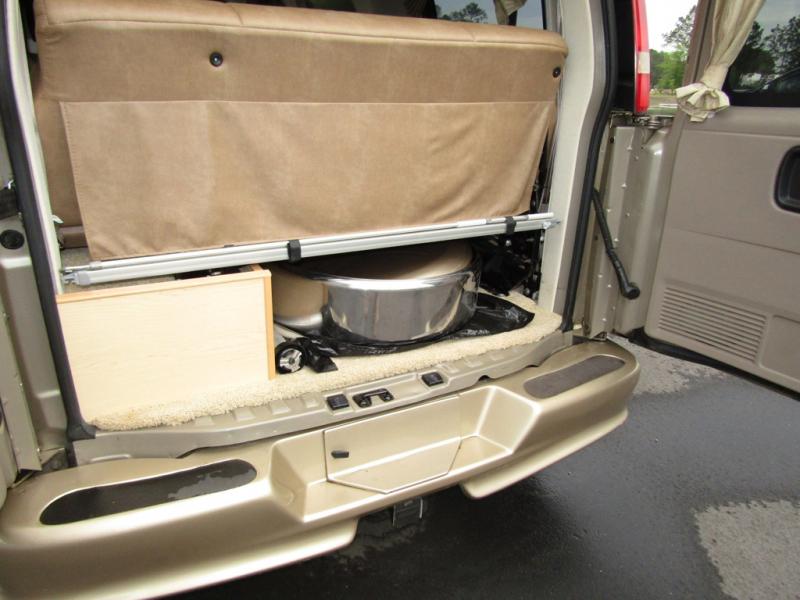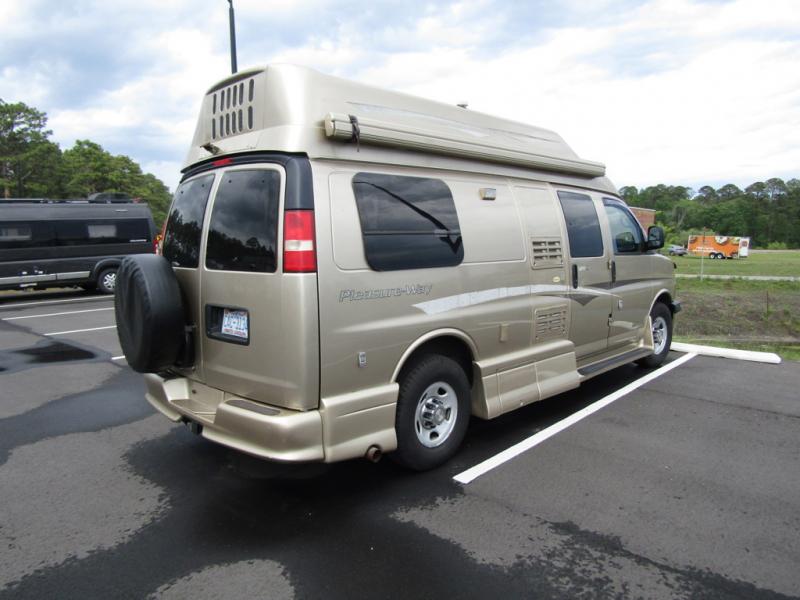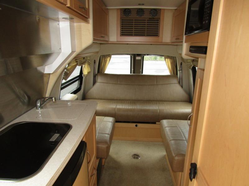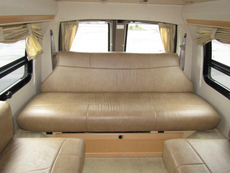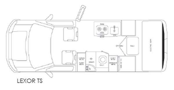 Pleasure-Way Lexor TS Class B motor home offers a 2 burner range and single sink in the kitchen area. In the rear of the motor home you will find two ottomans, a table, and an electric sofa which converts into a comfortable queen size bed.