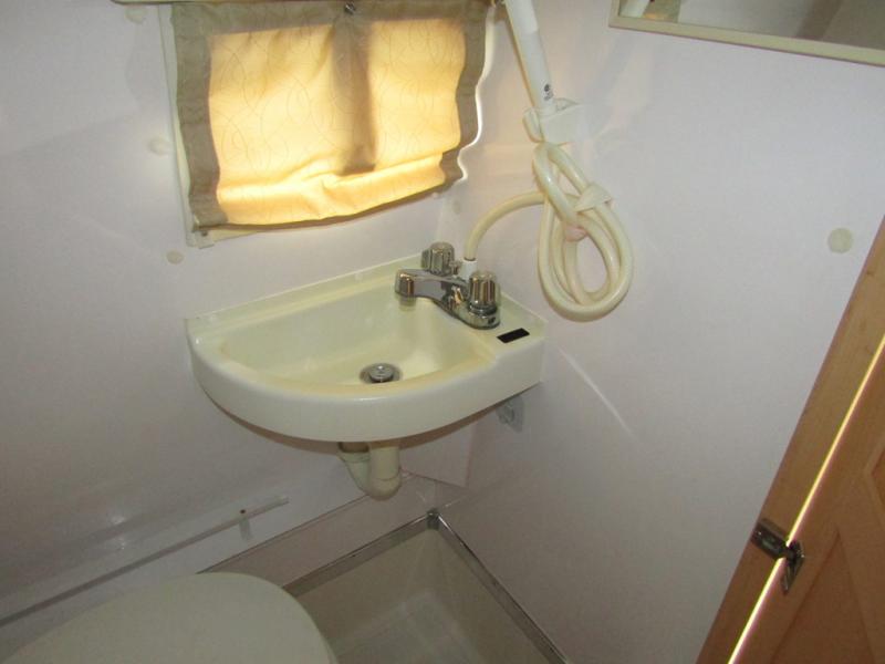 As you proceed forward through the motor home, there is a closet with a microwave above the closet. The bathroom offers a toilet, shower, and sink. Behind the driver's seat is a furnace with a cabinet above.
