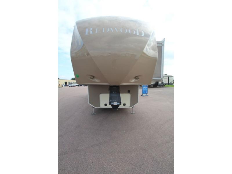 Redwood FW w/Rear Entertainment Center w/Overhead Storage & 40" TV, Ceiling Fan, Slideout Chairs & Free Standing Dinette, Slideout Sofa/Pantry/3 Burner Range/Refrig. & 2nd Pantry, Kitchen Island w/Dbl. Sink, Pull-Out Waste Basket, Step Up to Side Aisle Bath w/Toilet, Sink w/Med. Cabinet, & Tub/Shower, Front Queen Bed w/Chest, Wardrobe, Chest of Drawers w/Overhead & More! Available Options May Include: Washer/Dryer.