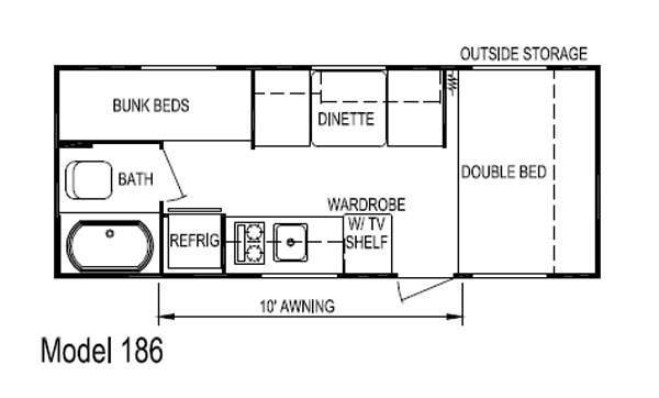 Nomad Retro Travel Trailer, Rear Bath w/Shower, Toilet, Bunk Beds, Dinette, Double Bed, Wardrobe w/TV Shelf, Single Galley Sink, 2-Burner Range, Refrigerator, Overhead Cabinets Throughout, Outside Storage, 12' Awning & Much More.