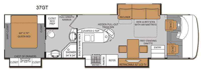 Challenger Class A Motor Coach w/Rear Queen Bed Slide, Closets Both Sides of Bed (1 Shirt Closet), Chest of Drawers Slideout w/Closets & 19" LCD TV, Walk-Thru Bath w/Sink, Angle Shower, Toilet, 2nd Sink, Full Length Mirror, Closet Washer/Dryer Prep, Elevated Counter Top, Hidden Pull-out Trash Bin, Dbl. Kitchen Sink, Built-In Wine Rack, Slideout 3 Burner Range w/Micro./Pantry/Refrig. & Dinette w/Chairs & Retractable 32" LCD TV, Slideout Hide-A-Bed Sofa w/Air Mattress & Recliner Combo, & More!