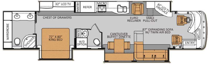 Thor Motor Coach Tuscany Class A Diesel Coach w/Rear Full Bath Including: Wardrobe, Corner Shower, Toilet & Vanity w/Dbl. Sinks, Chest of Drawers w/32" LCD TV Above/Pantry/Refrig./3 Burner Range w/Microwave Above/Dbl. Kitchen Sink/Euro Recliner/Pull-Out Table & 40" LCD TV w/Fireplace Below Full Wall Slideout, 87" Expanding Sofa w/Twin Air Bed & Cantilever Buffet Dinette Slide, 1/2 Bath w/Sink, Pantry, King Bed Slideout and Much More! Avail. Options May Include: Washer/Dryer.