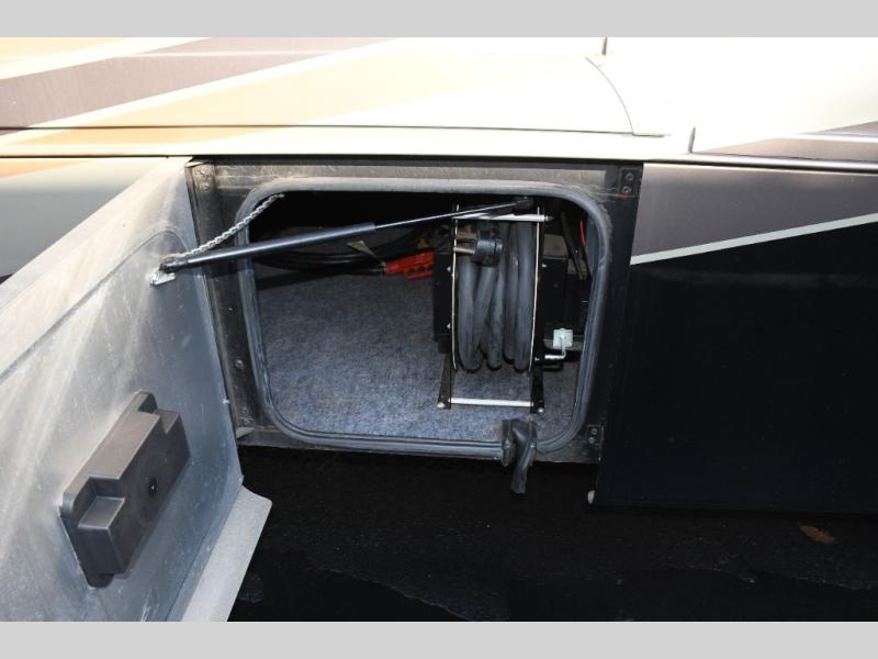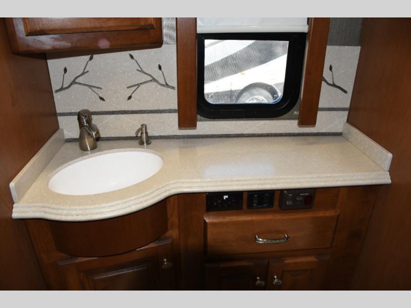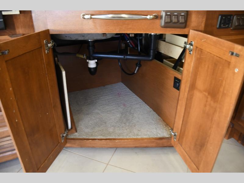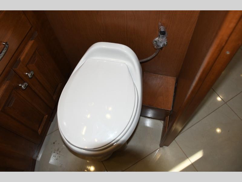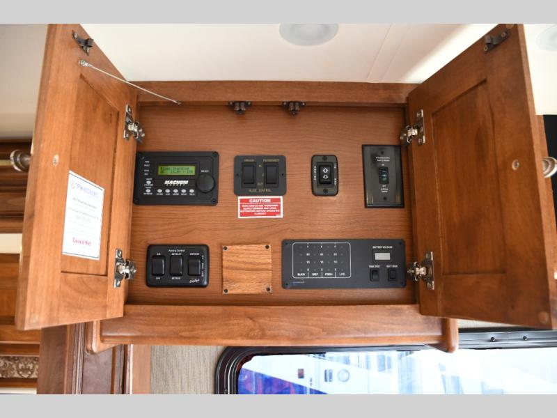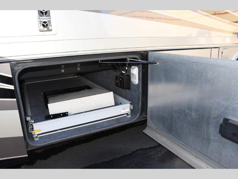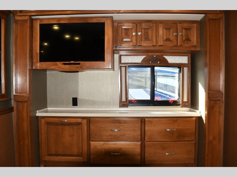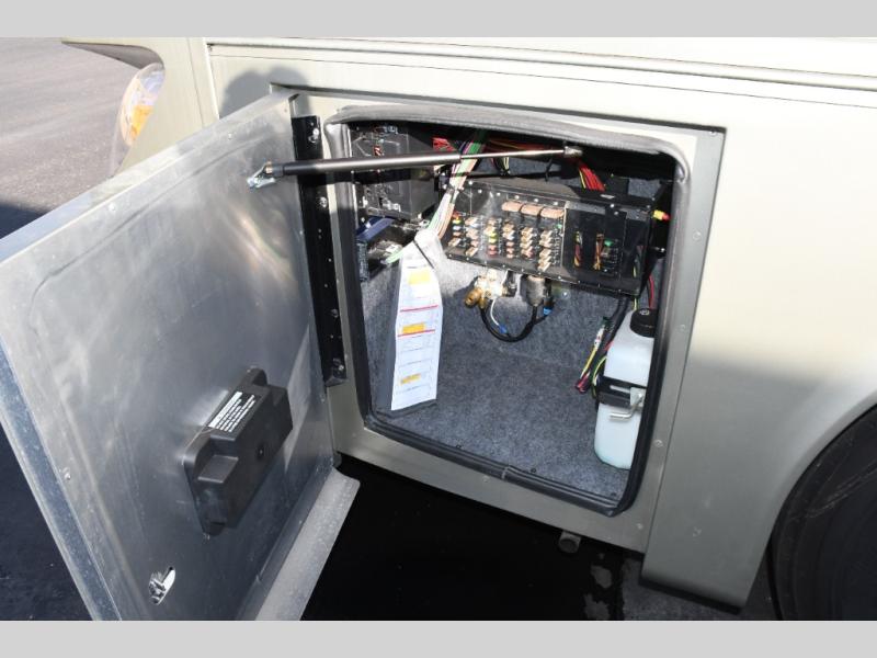 Inside, you’ll find a residential-style living area with ample seating, large panoramic windows, and well-appointed finishes that create a bright, inviting environment. The galley kitchen is equipped with quality appliances, generous counter space, and smart storage solutions for easy meal preparation on the road. The master suite offers privacy, a comfortable sleeping area, and abundant storage, while the bathroom provides full functionality with high-end fixtures and design.