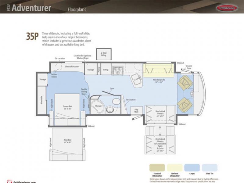 Winnebago Adventurer Triple Slide Class A Coach w/Rear Queen Bed w/Nightstands Slide, Ward./Storage, Base Cabinet/Chest of Drawers/Storage/Pantry/Refrig./3 Burner Range/Dbl. Kitchen Sink & Rest Easy Sofa Full Wall Slide, BenchMark Dinette Slide, 40" LCD TV, Corner Shower, Vanity, Toilet and More! Shown w/Ford F53 22,000 lb. Specs. Available Options May Include: Ford F53 24,000 lb., BenchMark Dinette w/Extendable Table & Chairs, 4-Door Refrig., Washer/Dryer, TV in Bedroom, King Bed.