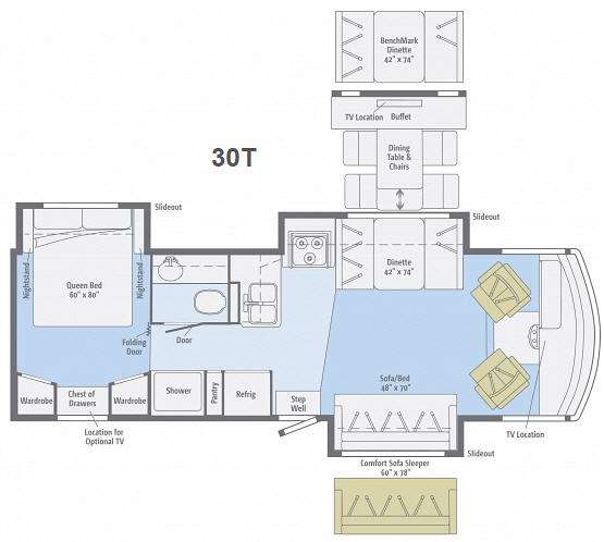 Winnebago Vista Class A Coach w/Rear Queen Bed Slideout w/Nightstands, Wardrobe/Chest of Drawers/Wardrobe, Folding Door to Hall w/Shower, Pantry, Refrigerator, Private Toilet & Sink Area, Dbl. Kitchen Sink, Overhead Cabinets, 3 Burner Range & Booth Dinette Slideout w/Overhead Storage Above Dinette, Sofa Bed Slide and Much More! Available Options May Include: Bedroom TV, Comfort Sofa Sleeper 60" x 78", Dining Table & Chairs w/Buffet IPO Booth Dinette or BenchMark Dinette.