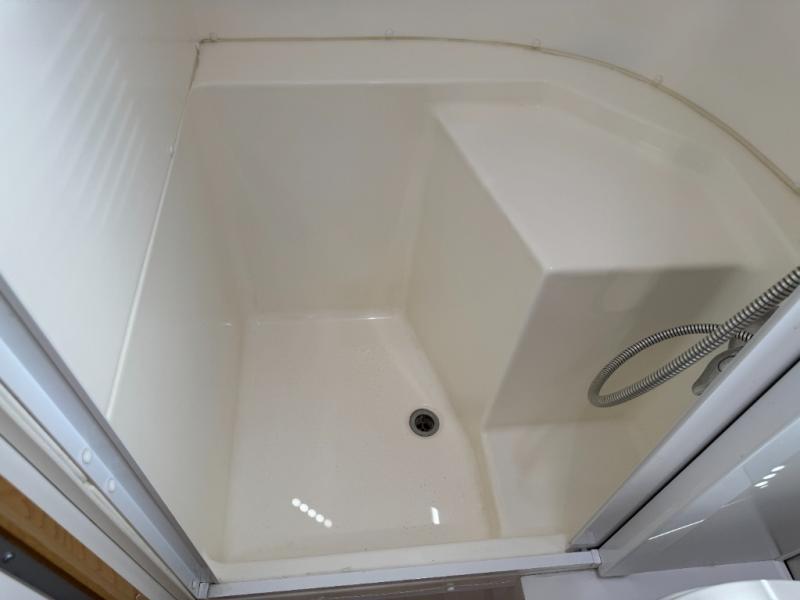 The bathroom area has a shower and toilet. Just outside of the bathroom there is a sink.