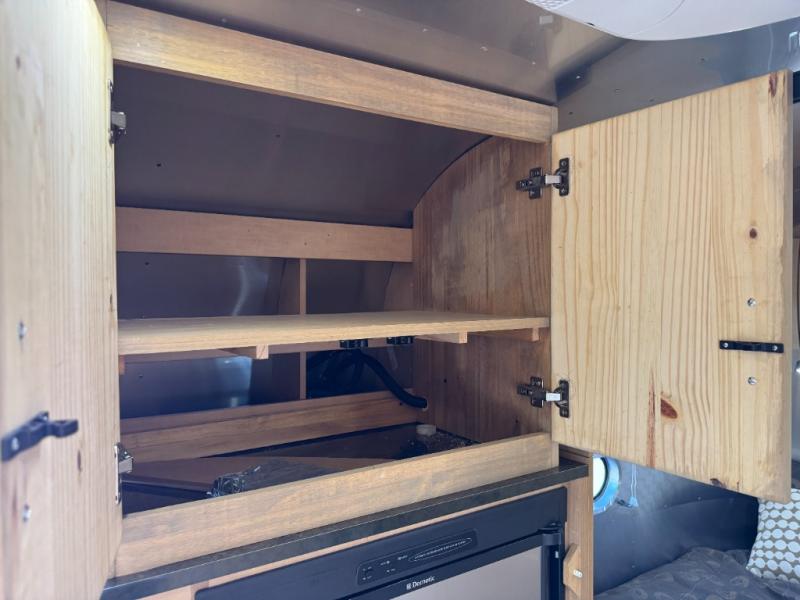The galley has a pantry, refrigerator and a LED TV above the refrigerator. On the opposite side of the travel trailer there is a sink and three burner range.