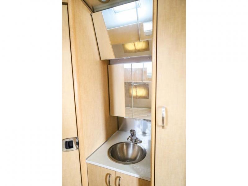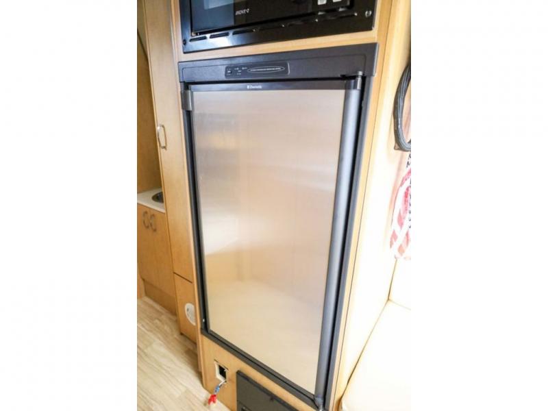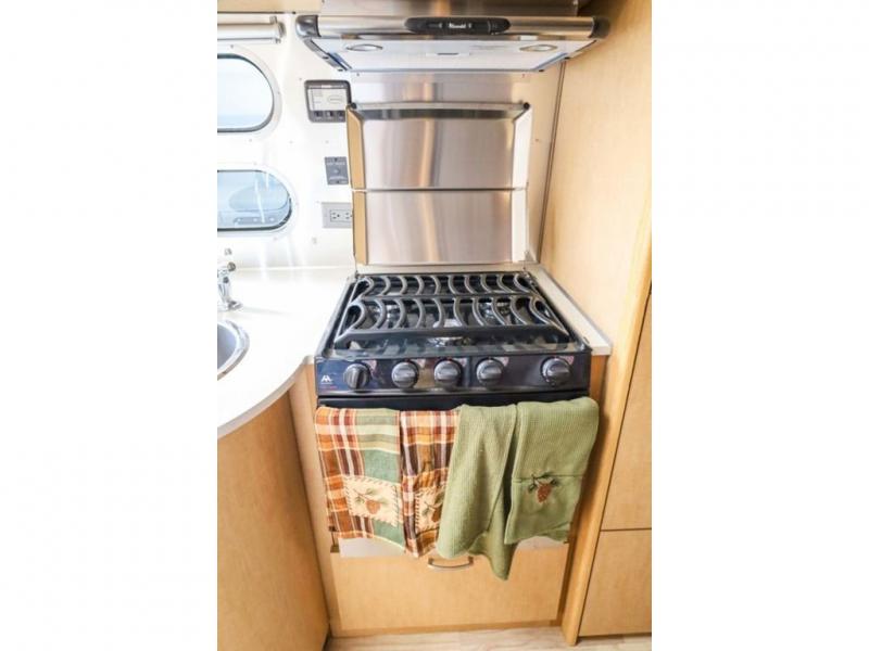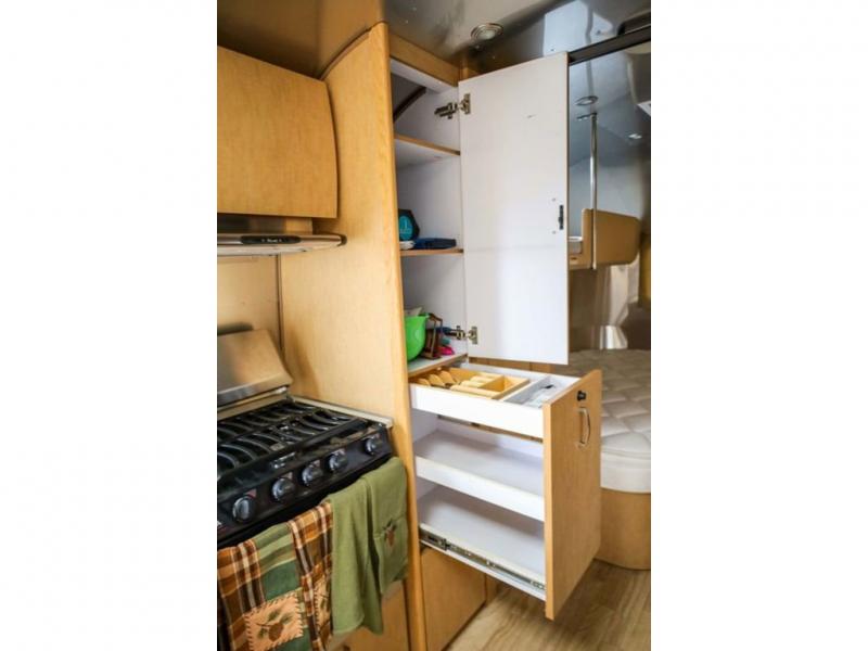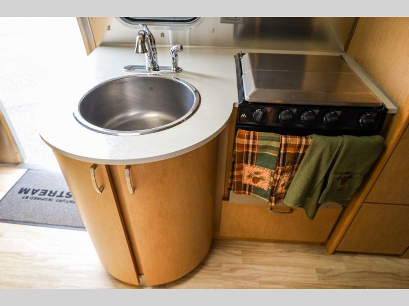 The galley has a sink, three burner range, and pantry on one side of the trailer. On the other side there is a refrigerator and a microwave above the refrigerator.