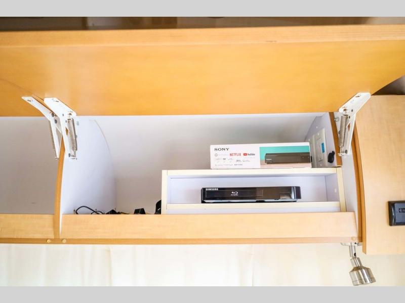As you enter the travel trailer, along the front wall you will find a dinette. Next to the dinette there is a comfortable sofa with a LED TV above the sofa.