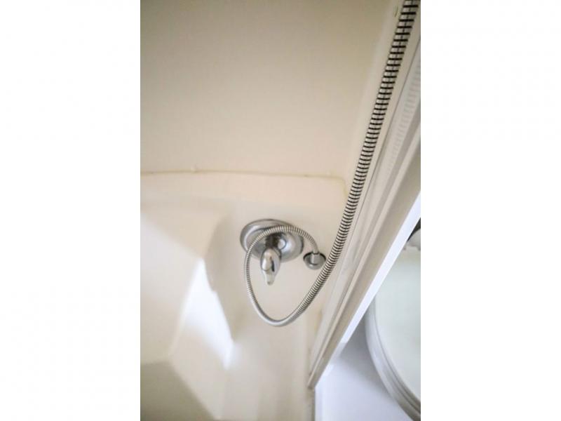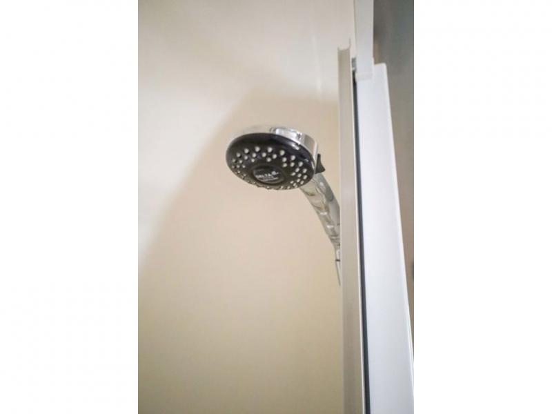 The bathroom has a shower and toilet. Just outside of the bathroom area there is a sink with a wardrobe next to the sink.