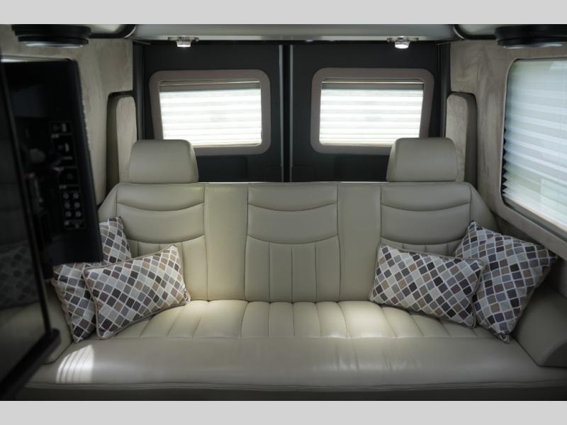 Unwind on the plush rear lounge that converts for sleeping or relaxing with scenic views through expansive windows. -