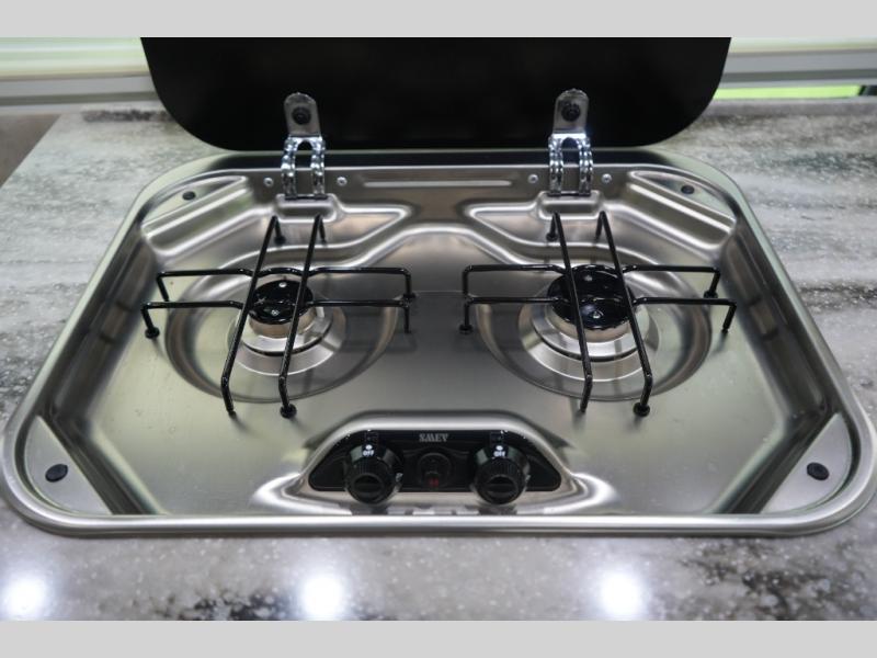 Includes a sleek sink, two-burner range, and an additional seat with its own removable table—ideal for quick meals or morning coffee. -