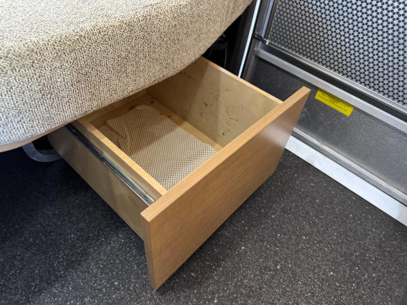 Next to the sink you will find a closet and in the rear, there is a bed with hampers on either side of the bed.