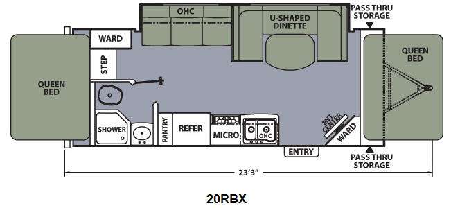 Step into this 20RBX Apex ultra lite travel trailer by Coachmen RV featuring a large side-out which makes the entire unit quite spacious inside. As you enter the model you are greeted by a large slide-out u-shaped dinette and sofa with overhead storage along with a front queen expandable tent bed immediately to your right. There is also a corner wardrobe with an entertainment center above. In the kitchen you will find all the amenities you need to prepare and serve your family's favorite meals. There is a convenient double kitchen sink, 3 burner range with microwave, refrigerator, and pantry for kitchen storage. Tucked in the rear corner of the unit is a complete full bath including an angled shower, toilet and sink. There is a step up to the second queen expandable tent bed and wardrobe nearby for all your storage needs and much more!