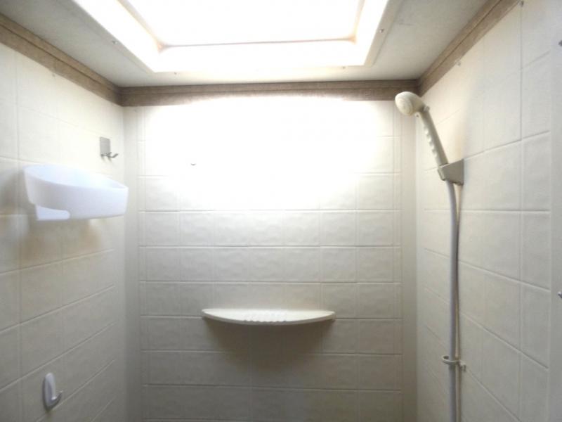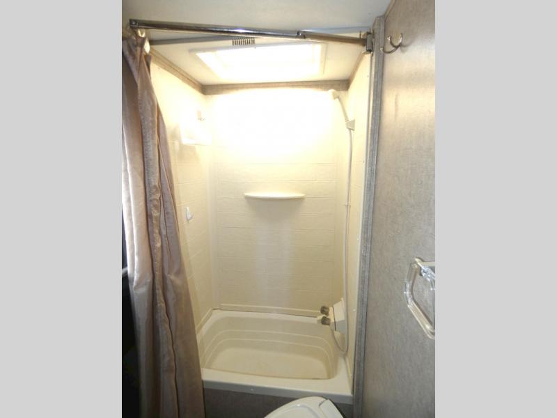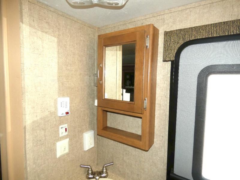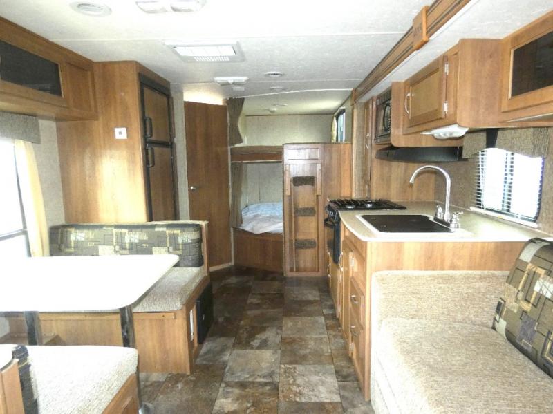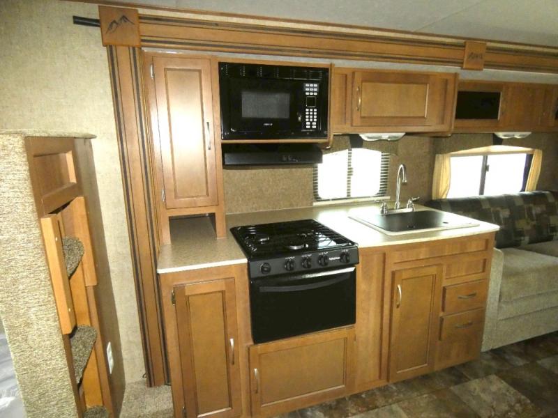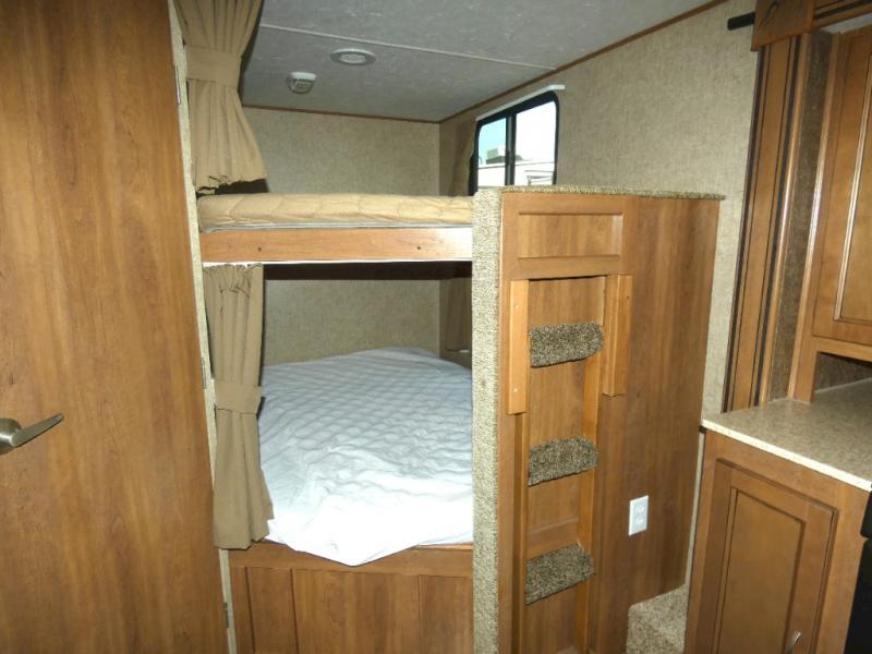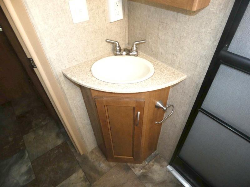 A double bed set of bunks offer plenty of sleeping for family or guests, and the convenient corner bath nearby has a tub/shower, toilet, sink and private entry. This is a great feature allowing the use of the bathroom with a quick step inside when you are enjoying the outdoors.