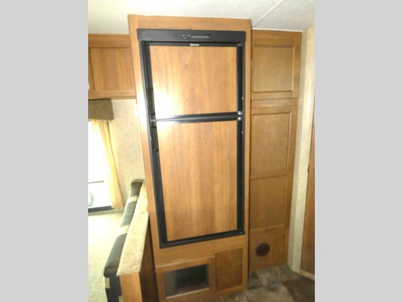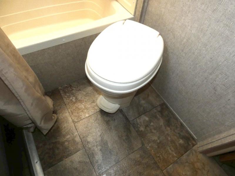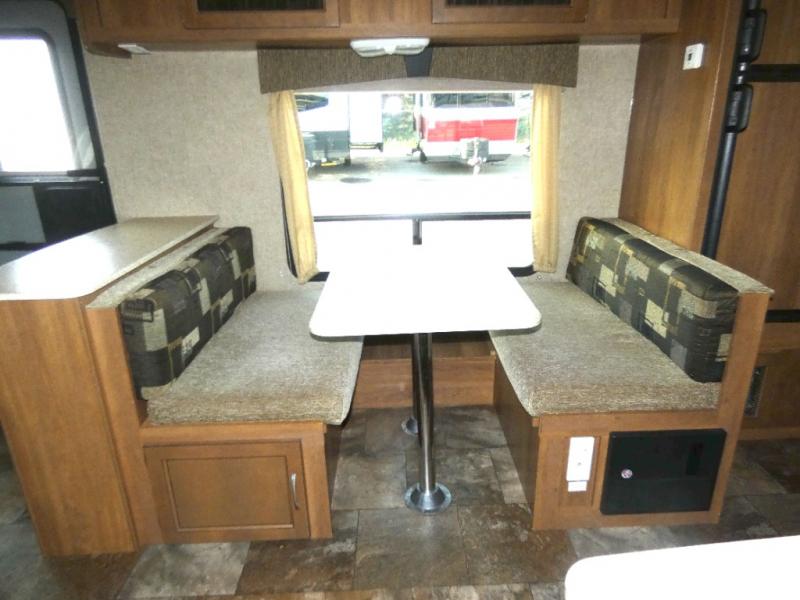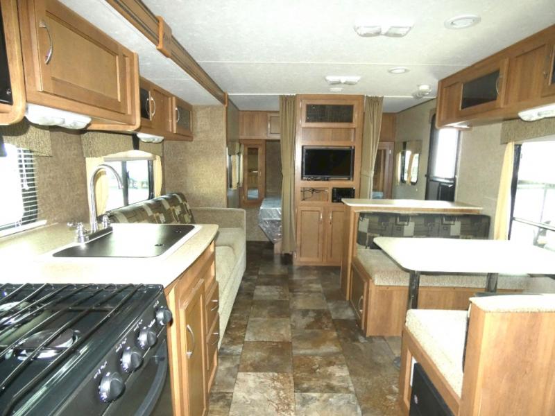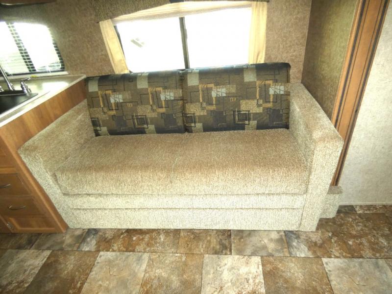 The large slide in the living area opens up the interior and provides a spacious at-home feel. On one side there is a slide-out that includes a sofa, a double kitchen sink, 3 burner range with microwave oven and pantry. Opposite the slide is a booth dinette for meal time, a refrigerator, and a wardrobe just outside the rear corner bath.