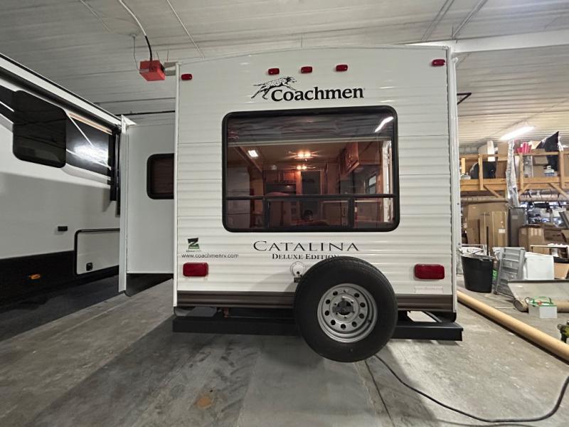 Catalina Deluxe Travel Trailer by Coachmen RV w/Rear Living Area Including: 2 Chairs w/Table Between & Overhead Storage, Sofa & U-Shaped Dinette Slide, Ent. Center, Kitchen Sink, 3 Burner Range, Microwave Above, Refrig., Pantry, Wardrobe, Slideout Sofa w/Upper Bunk, Bath w/Toilet, Sink, Tub/Shower, Kids TV Ent. Center in Hall, Front Queen Bed w/Wardrobes Both Sides, Overhead Storage, Bedroom TV & Wardrobe, Private Bedroom Entry and More!