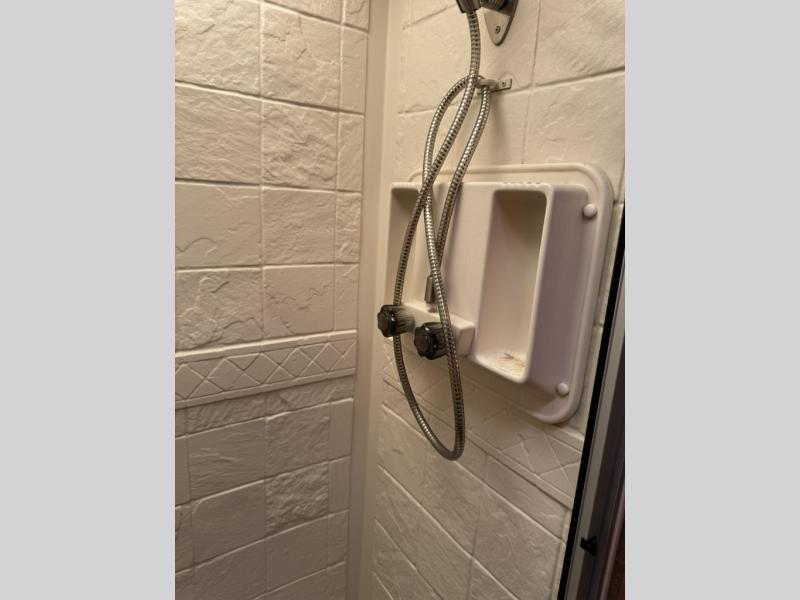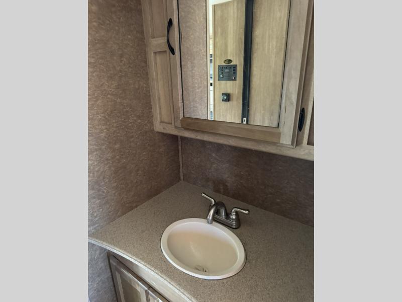 Head toward the back of the coach and pass through a split bath with sink on the left including a medicine cabinet. On the right find a private toilet and shower area with linen cabinet also.