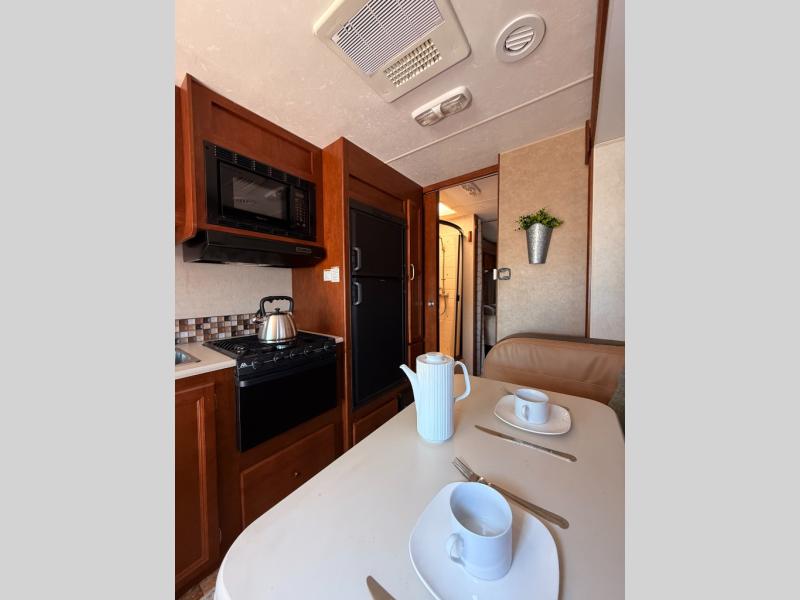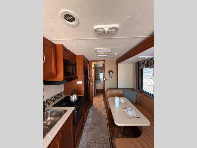 Step inside the entry door just beyond the passenger seat and see how spacious the main living area is with the large slide fully extended. There is a jack-knife sofa with overhead cabinet and a u-shaped dinette for mealtime and just hanging out.