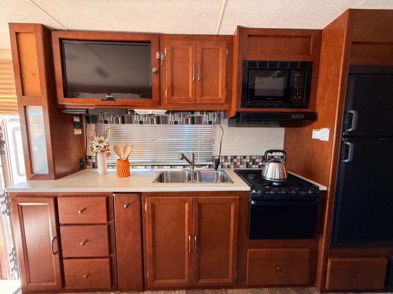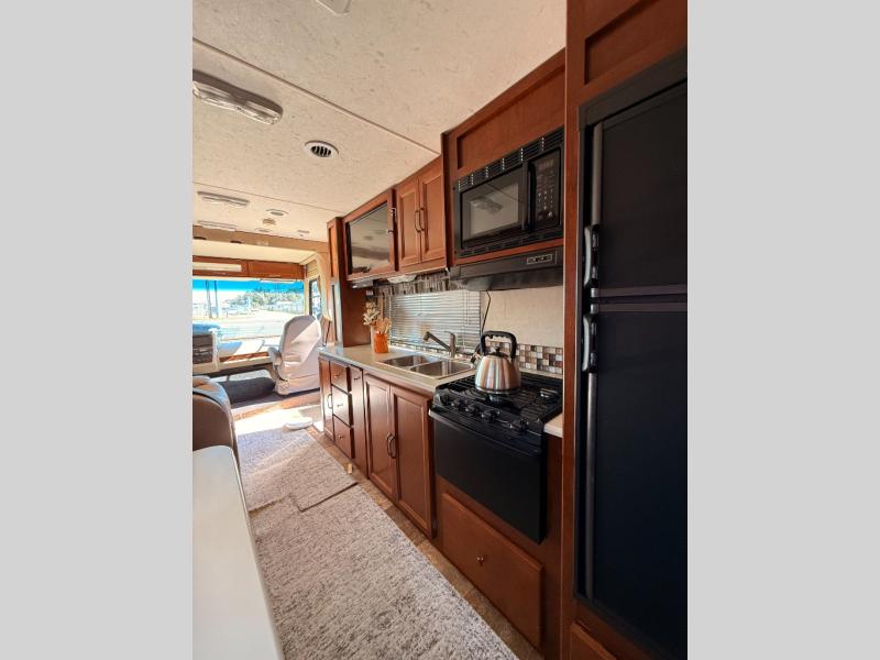 Opposite the slide is a complete kitchen with pantry, refrigerator, three burner range including overhead microwave, and double kitchen sink for easy cleanup. There is a counter area and plenty of overhead cabinets and places to store dishes and things. The lower cabinet features drawers also. There is also a 32" LCD TV for your enjoyment.
