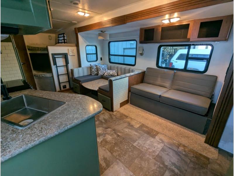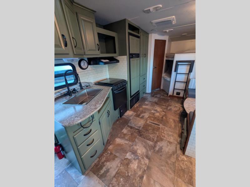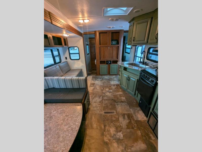 The main living area offers a slide with a sofa and a u-shaped dinette. On the opposite side of the trailer there is a double kitchen sink, three burner range, microwave, refrigerator, pantry, and wardrobe. Along the front of the living area you will find a nice size entertainment center.