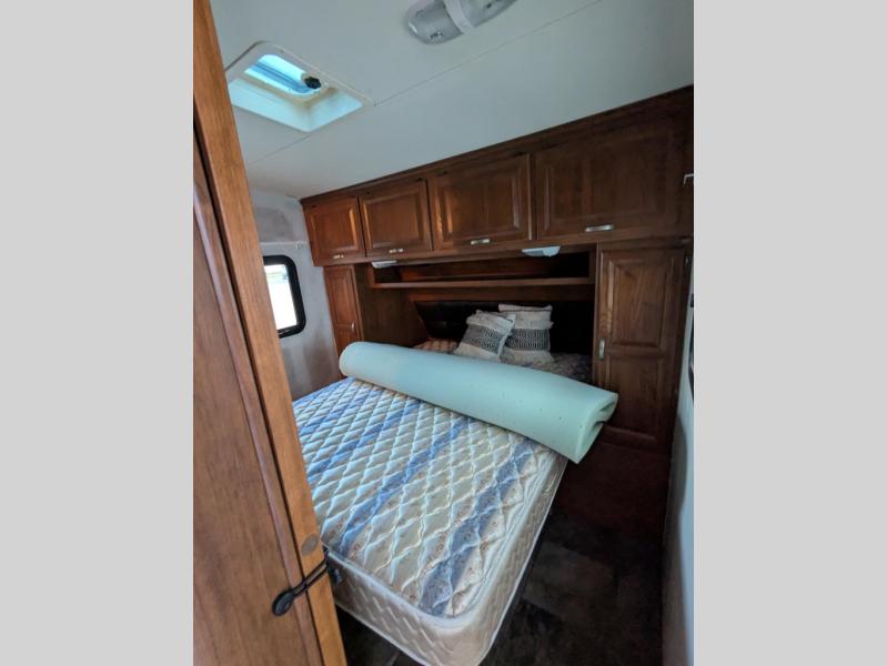 As you enter the travel trailer, to the right there is a front bedroom with a queen bed and shirt closets on either side of the bed.