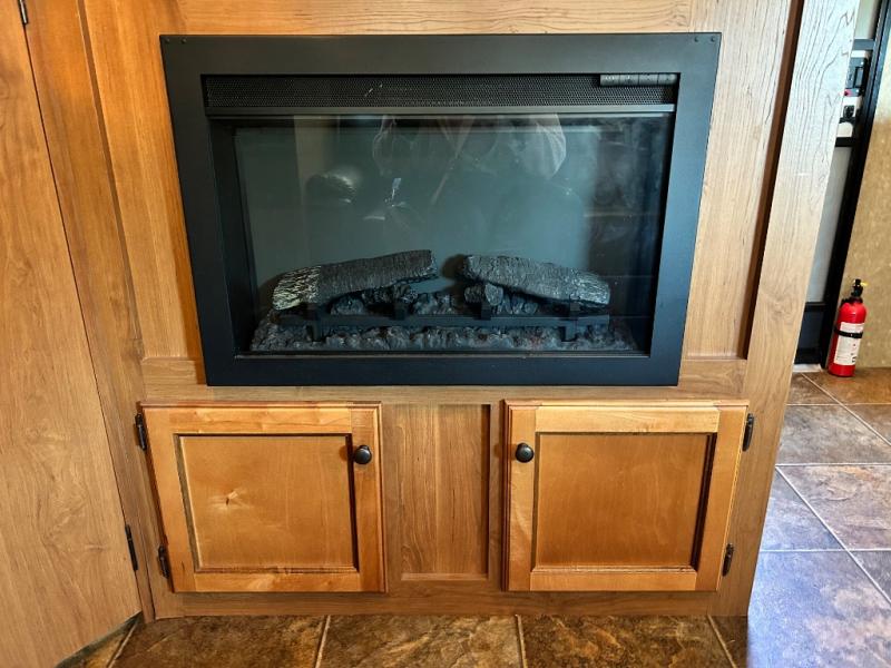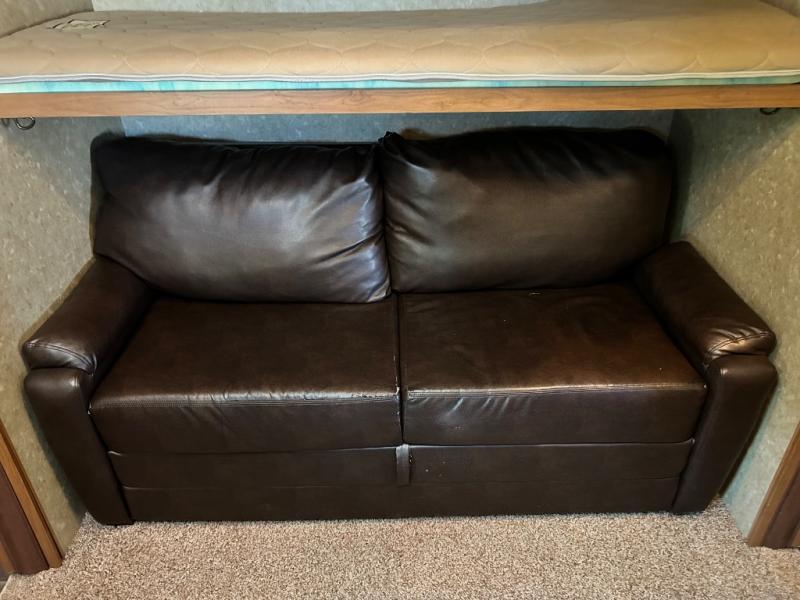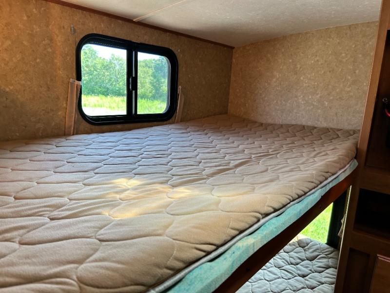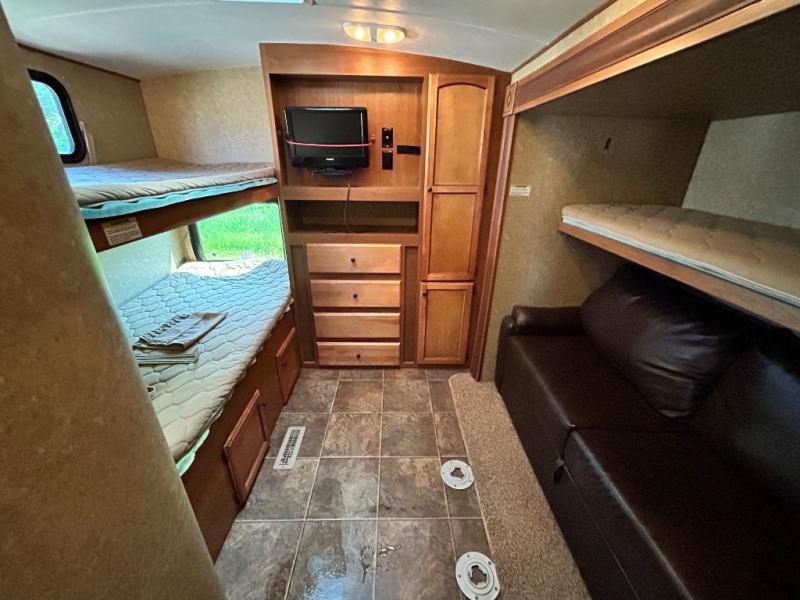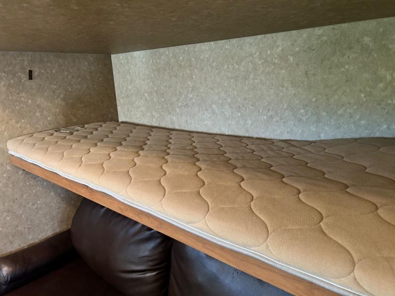 The rear bunk house has a slide with a sofa and a flip-up bunk above the sofa. On the opposite side of the trailer there is another set of bunks. Along the rear wall you will find a wardrobe which offers extra storage.
