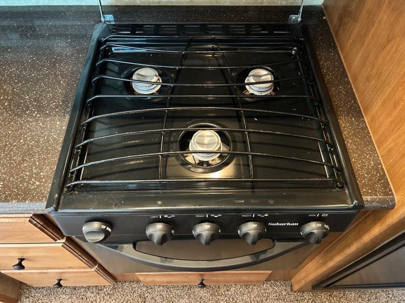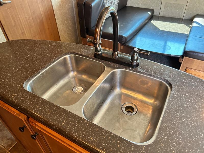 To the left of the entrance you will find a slide with a three burner range and refrigerator. Next to the slide there is a large pantry. On the opposite side of the trailer you will find a slide with a super booth dinette and a sofa. The kitchen island offers a double kitchen sink and extra counter space. To the right of the entrance there is a large pantry and wardrobe and an entertainment center.