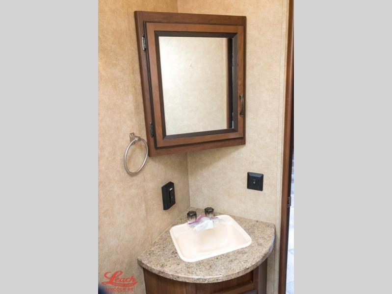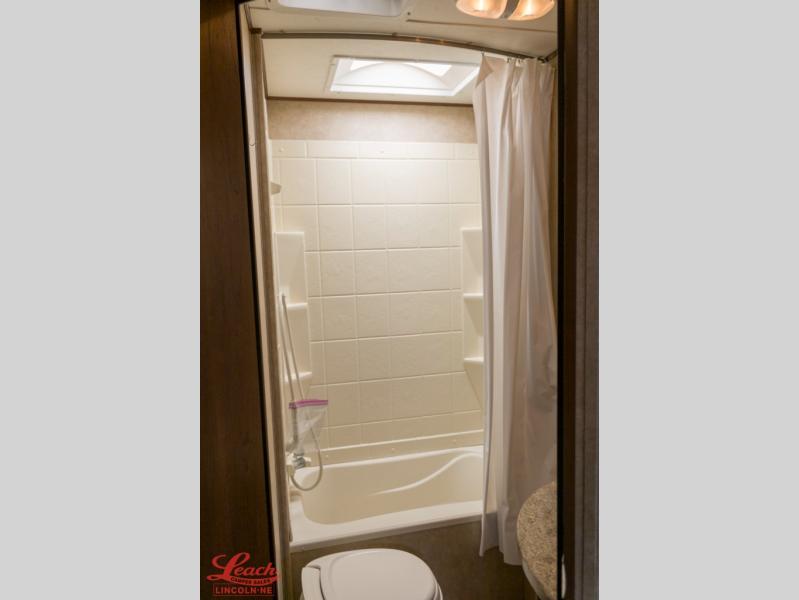 The bathroom is located in the rear of the travel trailer. You will find a sink, toilet, and tub.