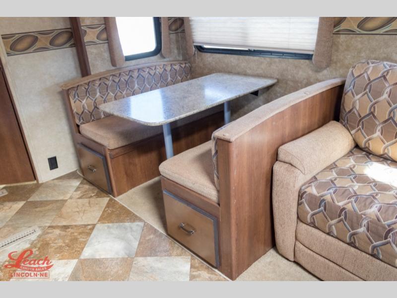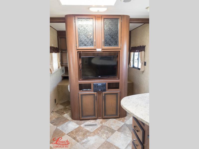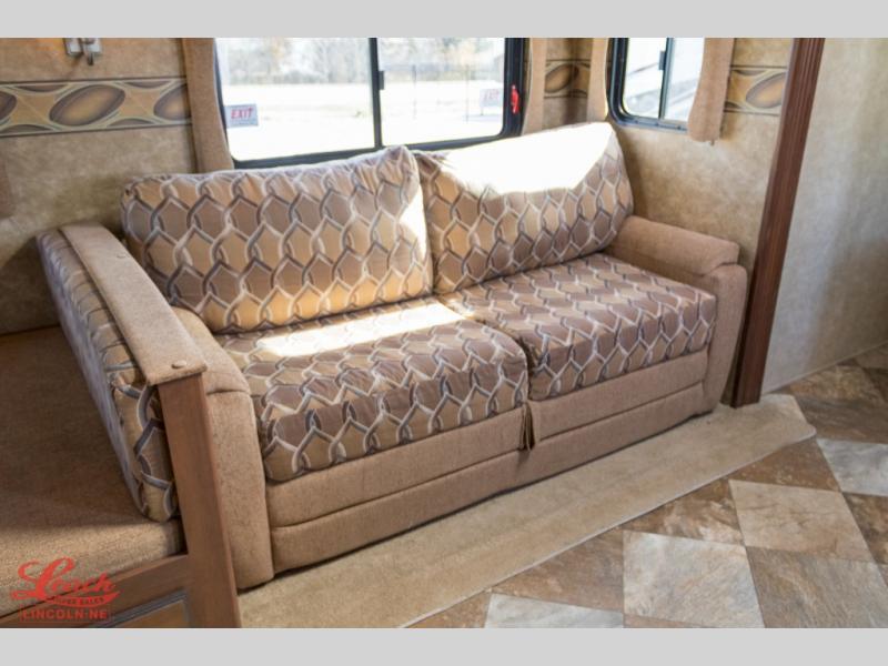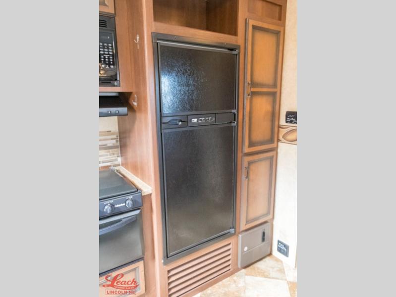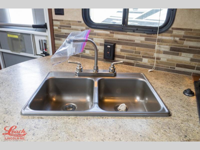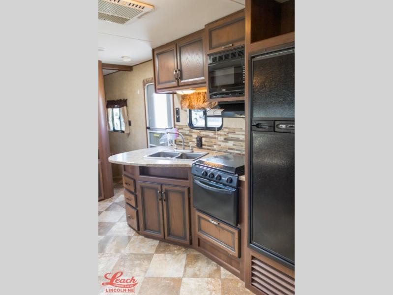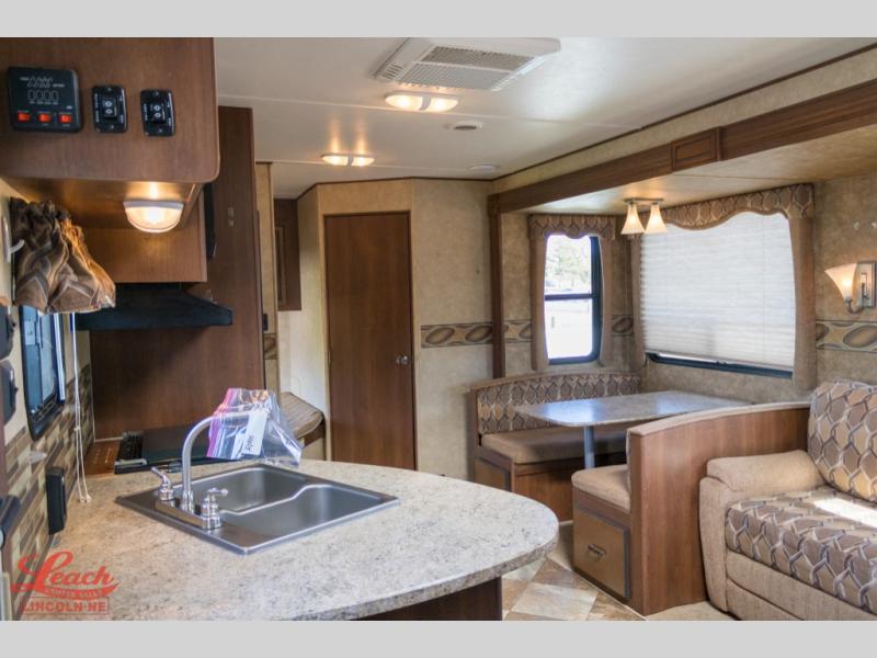 As you enter the travel trailer, to the left is a double kitchen sink, three burner range, microwave, refrigerator and pantry. The opposite side of the travel trailer has a slide with a super booth dinette and a jack knife sofa. You will also find a nice size entertainment center.