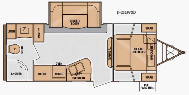 The Cruiser Fun Finder F-214WSD features a u-shaped dinette and a rear bathroom that is the full width of this travel trailer.