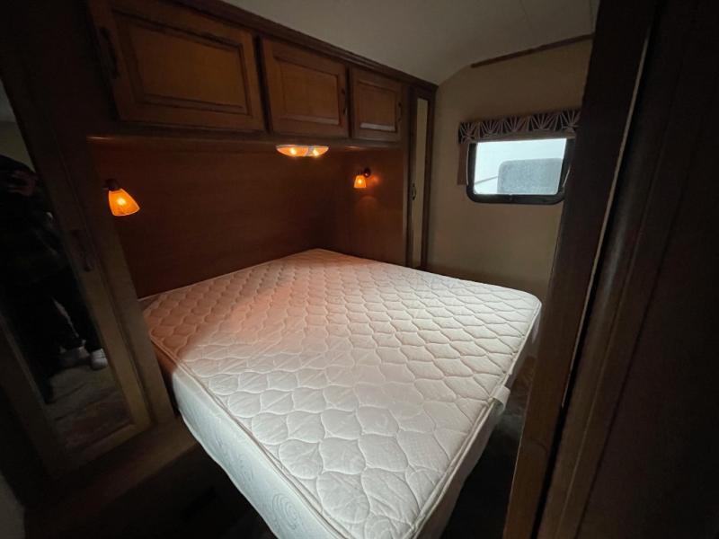 In the front enjoy a restful nights sleep on the lift-up queen bed accessible using one of the pocket doors on either side of the entertainment center. The bedroom features dual wardrobes for storage, plus the overhead cabinets, and space beneath the bed.