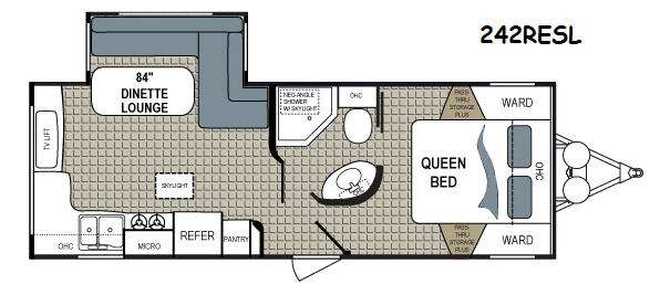 This Kodiak Ultimate travel trailer 242RESL by Dutchmen features a single slide-out with unique 84" z-shaped dinette lounge, rear kitchen, and front master suite.