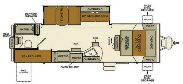 There are plenty of overhead cabinets throughout the travel trailer as well as a large exterior pass thru storage area. Outside in the rear, you will even find an exterior shower.