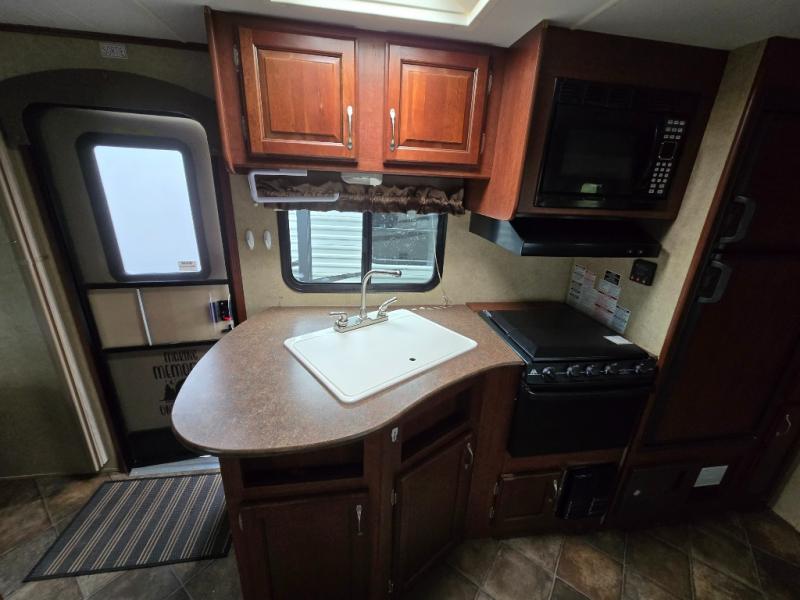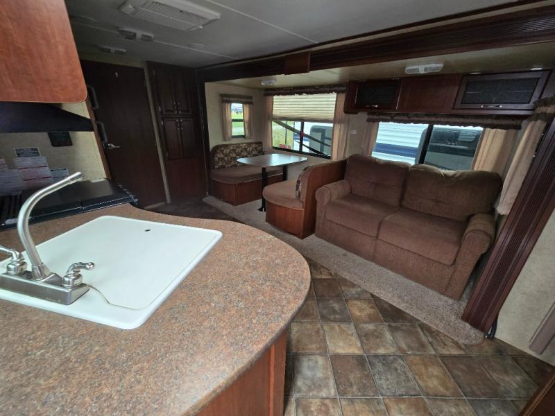 One side of the trailer offers a slide with a sofa and a dinette. Next to the dinette you will find a storage cabinet. The opposite side of the trailer has a large sink, microwave, oven, refrigerator, and pantry.