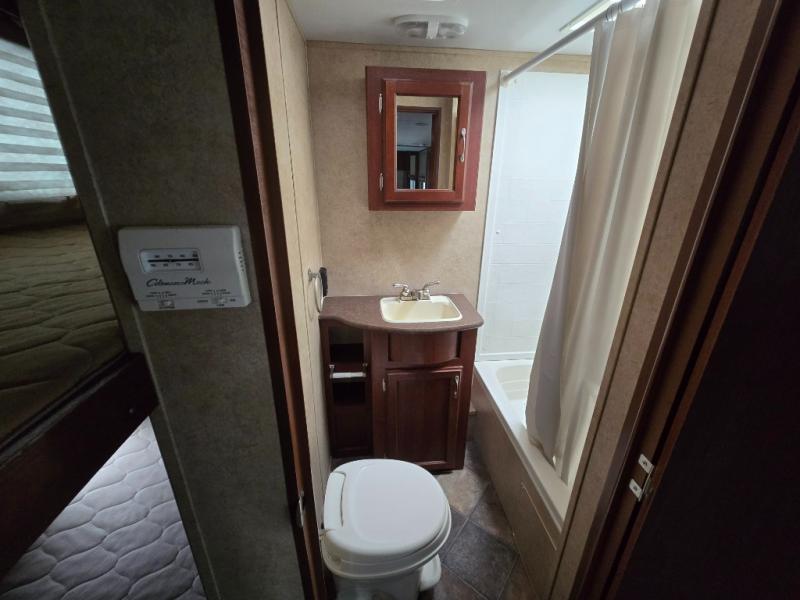 The bathroom is in the rear of the trailer as well. You will find a toilet, sink, medicine cabinet, and tub.