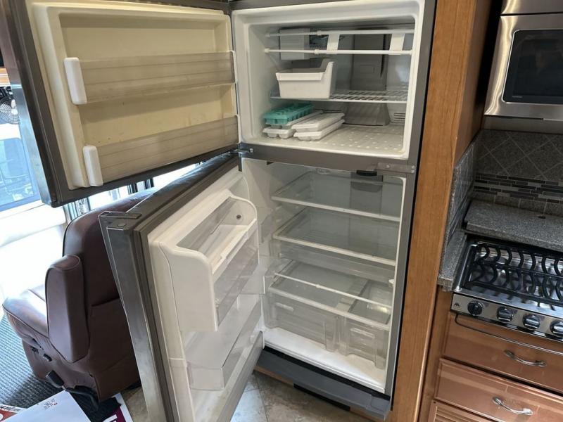 Stepping inside the 40X Expedition motor home by Fleetwood, you will be impressed with all of the space that is available. To the left of the entrance is a slide with a refrigerator, three burner range, microwave, double kitchen sink, dual recliners, and end table. The opposite side of the motor home has another slide with free-standing dinette and sofa. You can enjoy watching tv on the 46" LED tv.