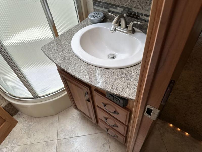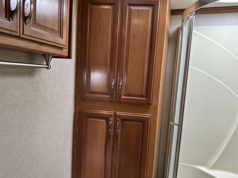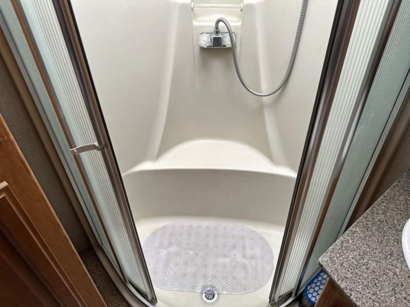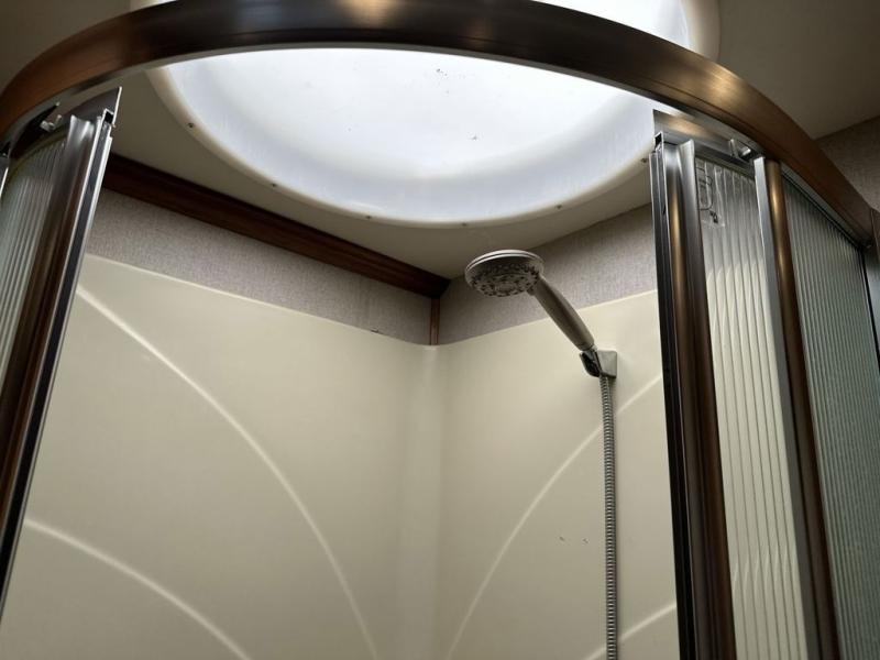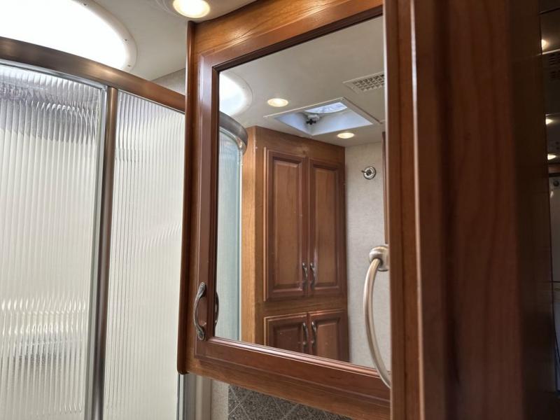 Proceeding toward the rear of the motor home, you will come to a bathroom. Inside you will find a sink, linen cabinet, corner angle shower, and toilet.