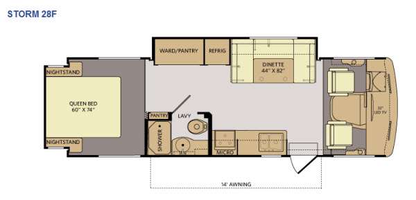 Stepping inside the 28F Storm motor home by Fleetwood, you will immediately notice the u-shaped dinette. Along the same slide as the dinette there is a refrigerator, wardrobe and pantry. To the left of the entrance you will find a double kitchen sink, three-burner range, and microwave. The bathroom will be on your left as you proceed toward the rear of the motor home. In the bathroom you will find a toilet, sink, and shower. There is an extra pantry right outside of the bathroom. The bedroom is very spacious and offer a queen bed and two nightstands. There is plenty of overhead cabinet space for your belongings. You can even choose the following options for your motor home, a bedroom 19" LCD tv, hide-a-loft drop down queen bed, and an entertainment center with 32" LED tv.