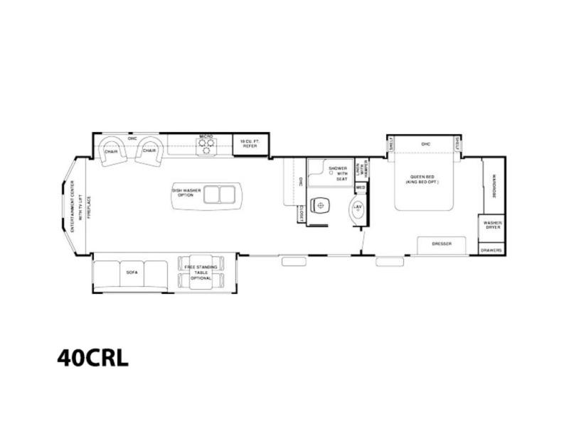 The rear entrance will lead you to the kitchen and living area. To the left of the entrance is a free-standing table and chairs and sofa slide. The rear wall offers a tv and fireplace. The second slide has two lounge chairs, a pantry with drawers, microwave, three burner range, pantry, and refrigerator slide. There is a kitchen island with a double kitchen sink, and front closet.