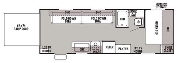 As you enter the cargo area you will notice the 69" x 74" ramp door, LCD TV mount in the corner, and two fold down sofas. On the opposite side there is a large kitchen sink, three burner range, microwave, refrigerator, and large pantry. Next to the pantry you will find a LCD TV mount.
