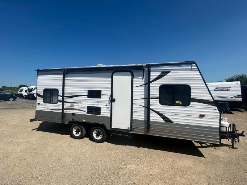 The Cherokee Wolf Pup 22BP travel trailer boasts a rear bunkhouse as well as a rear bathroom.