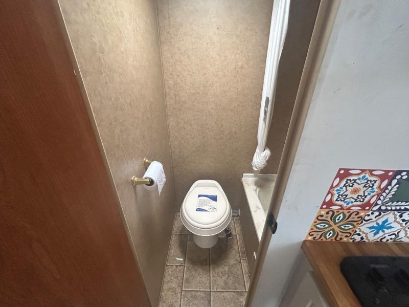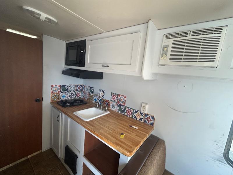 Two bunk beds are located in the rear left of the travel trailer. A bathroom including a toilet and tub/shower combination is in the right rear. Continuing around you will find a two burner range, single galley sink, countertops and overhead cabinets. A pantry and a refrigerator/entertainment center are housed on the opposite wall.