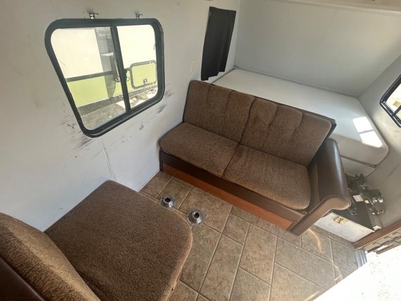 Directly across from the entry door is a dinette with jack knife sofa. A front queen size bed has overhead cabinets located along the front wall of the Wolf Pup 22BP.