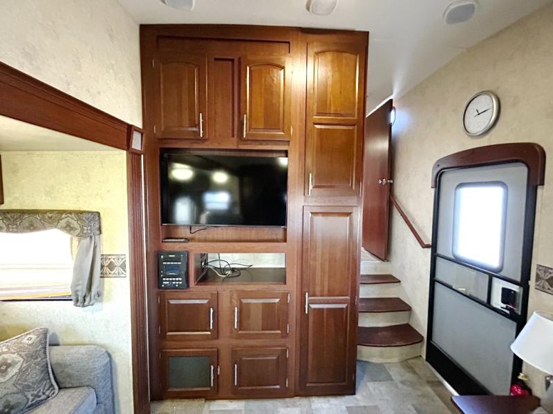 Upon entering the fifth wheel, to the left there are two lounge chairs, and an end table. The kitchen is in the rear and has a double kitchen sink, three burner range, refrigerator, and pantry. The slide offers a dinette and a hide-a-bed sofa. Next to the slide you will find an entertainment center and storage.